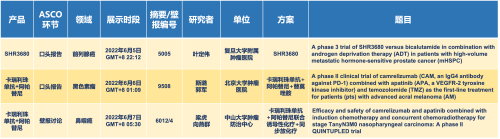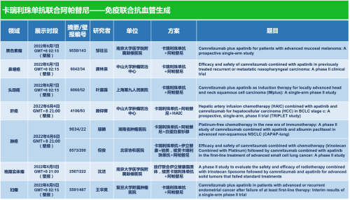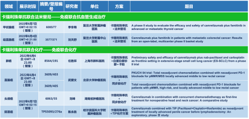 卡瑞利珠单抗联合门徒娱乐医药的另一款创新药法米替尼在甲状腺癌和结直肠癌领域有2项研究被接收为壁报,另有卡瑞利珠单抗联合化疗的4项研究在肺癌、结直肠癌、头颈癌和阴茎癌领域的研究被接收为5份壁报。