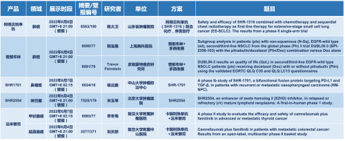 2022 ASCO年会另有5款门徒娱乐医药上市前抗肿瘤创新药的相关研究被接收为壁报,包括SHR-1316、普那布林、法米替尼、SHR-1701和SHR2554,他们的单药或联合方案相关7项研究被接收为壁报,覆盖肺癌、鼻咽癌、淋巴瘤、甲状腺癌和结直肠癌等领域。