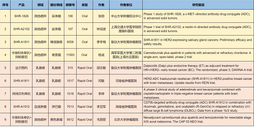 涉及的创新药包括6款已上市创新产品:注射用卡瑞利珠单抗(艾瑞卡®)、甲磺酸阿帕替尼片(艾坦®)、马来酸吡咯替尼片(艾瑞妮®)、羟乙磺酸达尔西利片(艾瑞康®)、阿得贝利单抗注射液(艾瑞利®)、氟唑帕利胶囊(艾瑞颐®),以及9款未上市创新产品:抗PD-L1/TGF-βRII双抗瑞拉芙普-α(SHR-1701)、多靶点受体酪氨酸激酶抑制剂法米替尼、IL-15融合蛋白SHR-1501、双特异性抗体SHR-2017、全人源抗CTLA-4单克隆抗体SHR-8068、抗体偶联药物(ADC)瑞康曲妥珠单抗(SHR-A1811)、SHR-1826、SHR-A1912、SHR-A2102。2类新药盐酸伊立替康脂质体注射液(II)(越优力®)及国内首仿药昂丹司琼口溶膜(艾其速®)各有1项研究入选。