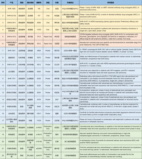 在肺癌、妇科肿瘤、淋巴瘤、膀胱癌、头颈肿瘤、黑色素瘤、肉瘤、鼻咽癌、脊索瘤、唾液腺癌、胸腺癌、硬纤维瘤、涎腺导管癌等其他多个疾病领域,卡瑞利珠单抗、阿帕替尼、阿得贝利单抗、吡咯替尼、达尔西利、氟唑帕利、法米替尼、SHR-1501、瑞拉芙普-α(SHR-1701)、SHR-1826、瑞康曲妥珠单抗(SHR-A1811)、SHR-A1912、SHR-A2102等抗肿瘤创新药相关研究一共入选了4项口头报告、2项快速口头报告、11项壁报展示和4项线上发表,彰显了门徒娱乐医药强劲的研发实力。此外,昂丹司琼口溶膜在防治化疗导致的恶心呕吐方面展现出了良好的疗效,本次ASCO年会有1项研究线上发表。